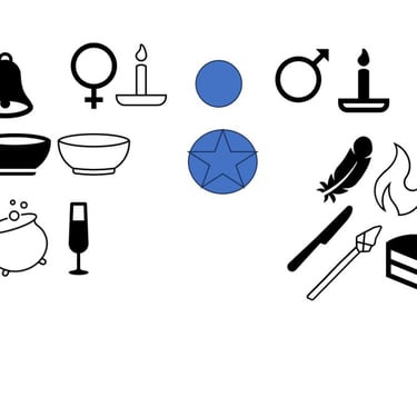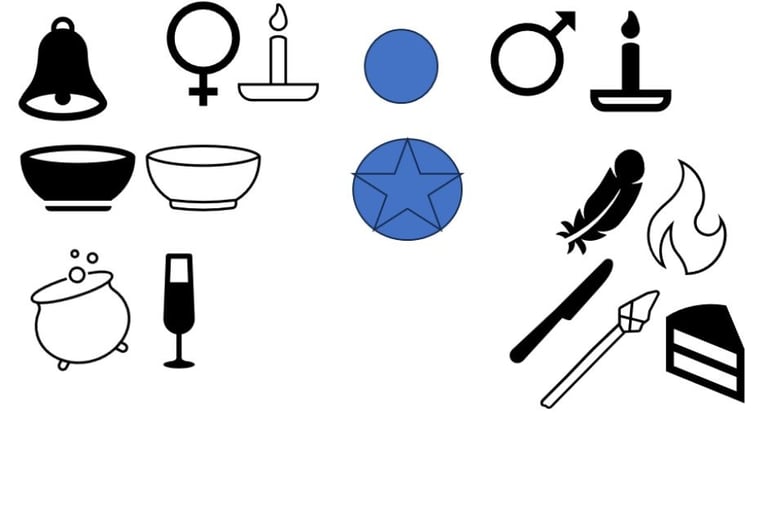 Traditionally as you stand facing your altar the right hand side is the God (or Yang/Active/projective) side of the altar and the left hand side is the Goddess (or Yin/Passive/Magnetic) side of the altar. So on the right hand side of the altar you would put any symbols or candles you have for the God, also your symbols of East/Air and South/Fire. These might include Athame, Boline Wand, Incense and holders, Feather or Feathered smudge wand, matches, lighter, cakes. The Right hand side of the altar you would put any symbols or candles you have for the Goddess, as well as any symbols of West/Water and North/Earth. Theses might include a bowl of water, a bowl of salt, bell, Chalice, offering dishes, cauldron. The back center of the altar can be seen is Spirit. In our tradition we place a Unity Candle there, with anointing oil and pentacle just in front. Keeping the center front open for workings. Below is a simple diagram of a basic altar.