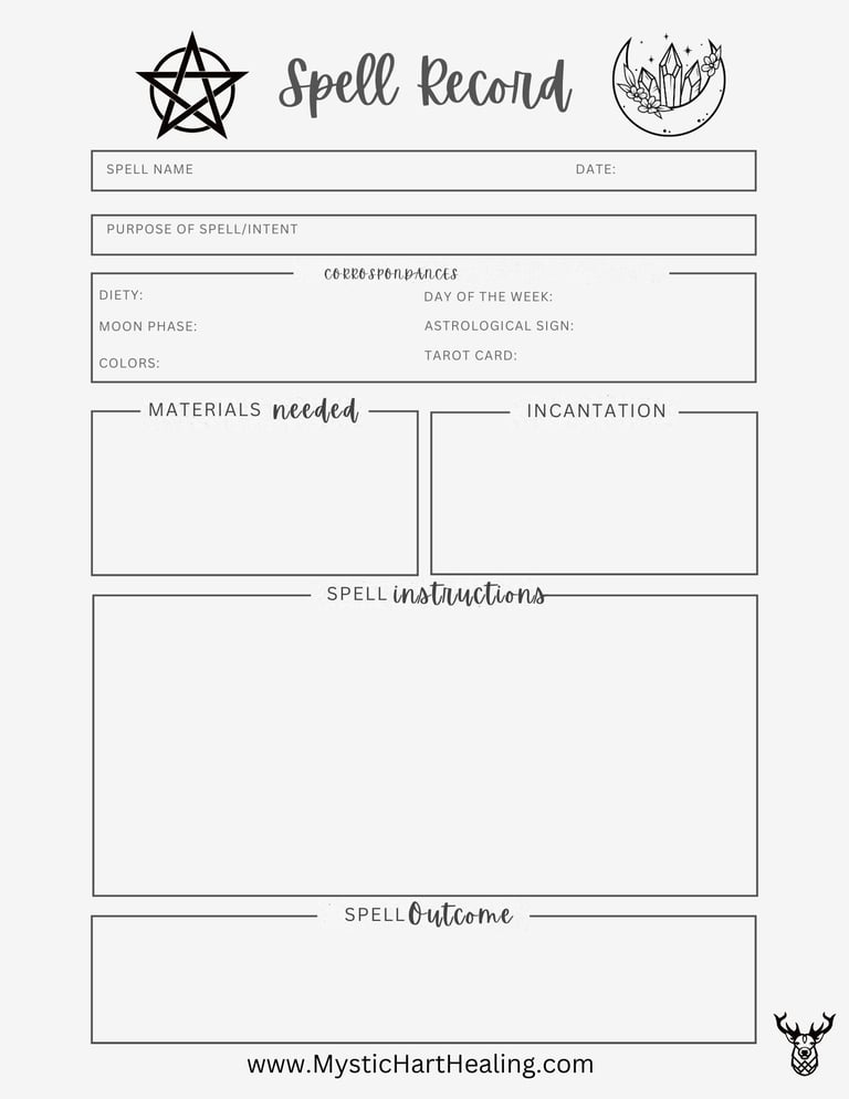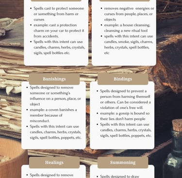 BOS page for a Spell Record is designed to help you write your spells and also track your spells. The other graphic is a listing of different types of spells used in witchcraft.