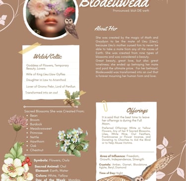 Lleu’s cousins and the most powerful wizards in Wales, Math and Gwydyon, decide to remedy this curse. They met one night in the woods and created a woman for Lleu that was not of any of the races of Earth. She would be made from the blossoms of flowers. They choose nine blossoms, combined them together, and with their combined magic created a woman that was considered the most beautiful in the world.