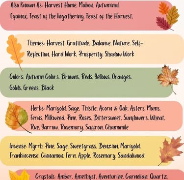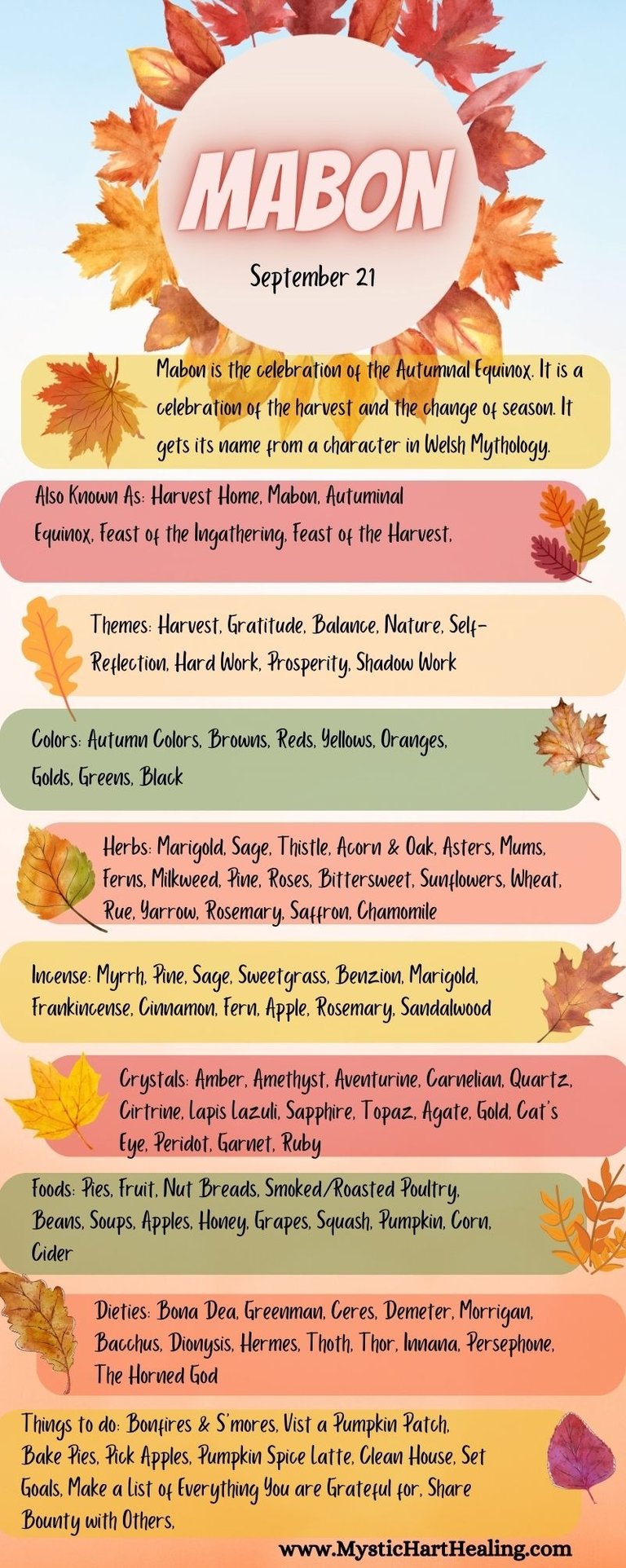 This is the Pagan Thanksgiving festival. Mabon is the second of three harvest festivals within the Wiccan Calendar. The name Mabon was from a Welsh myth involving a god named Mabon. The holiday took on that name around the year 1974 when American witch, Aidan Kelly coined the name for the Sabbat. Kelly was looking for a Celtic equivalent to the myth of Persephone and discovered the myth of Mabon ap Modron (Divine Son of the Divine Mother). The god was stolen from his mother’s side when he was just 3 days old and he then spent years imprisoned within the walls of a castle in Caerloyw. This story is told in the Mabignogi. For whatever reason, Kelly decided that this god’s name should be the name of the holiday at the Autumn Equinox. Mabon, according to writer Mhara Starling, has nothing to do with the autumn or the holiday.