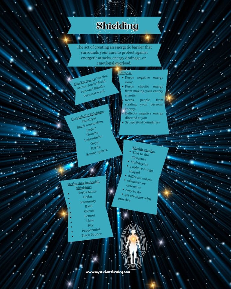 You can use different colors as well. Here is a basic list of colors and how you might use them for shielding. I would note that if a particular color invokes a different feeling or aspect for you, I would encourage you for the purpose of shielding to use that color as feels most natural for you.