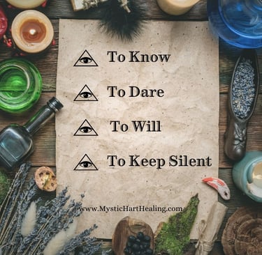 To Keep Silent…This is the hardest part. Once you cast your spell and are doing your work, you tell no one what you are doing. By talking about your spell, it is believed that you are calling the spell’s energy back to you and not allowing it to do its job. Also, by talking about your workings, you are allowing others to cast doubt on your workings, others could cast counter spells, or maliciously undo your work. To Dare and To Will are about being certain and focused, but even the most innocent of words from another can make you doubt yourself and disrupt that certainty and focus. It is best to just be quiet about what you do until your spell completes its work.